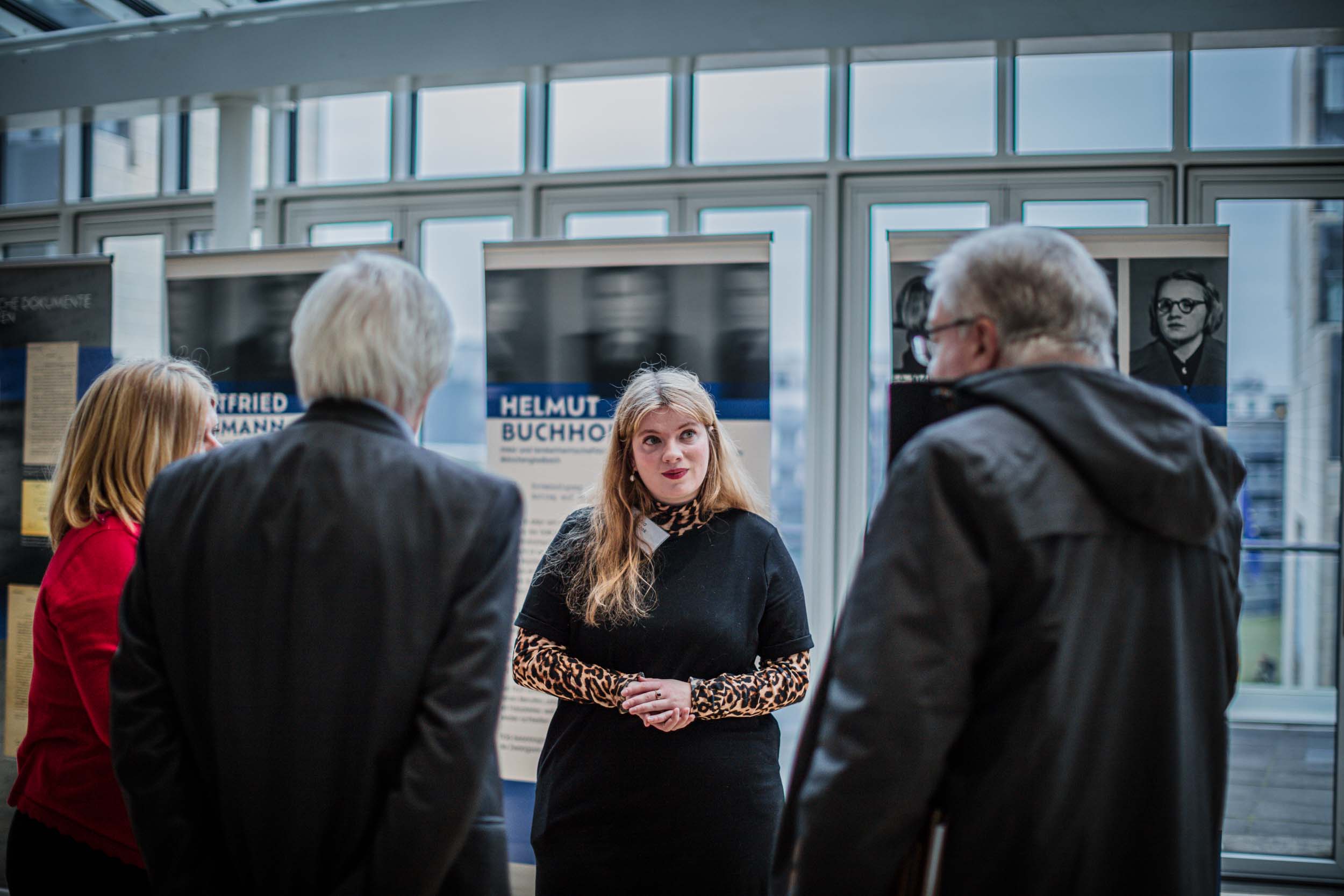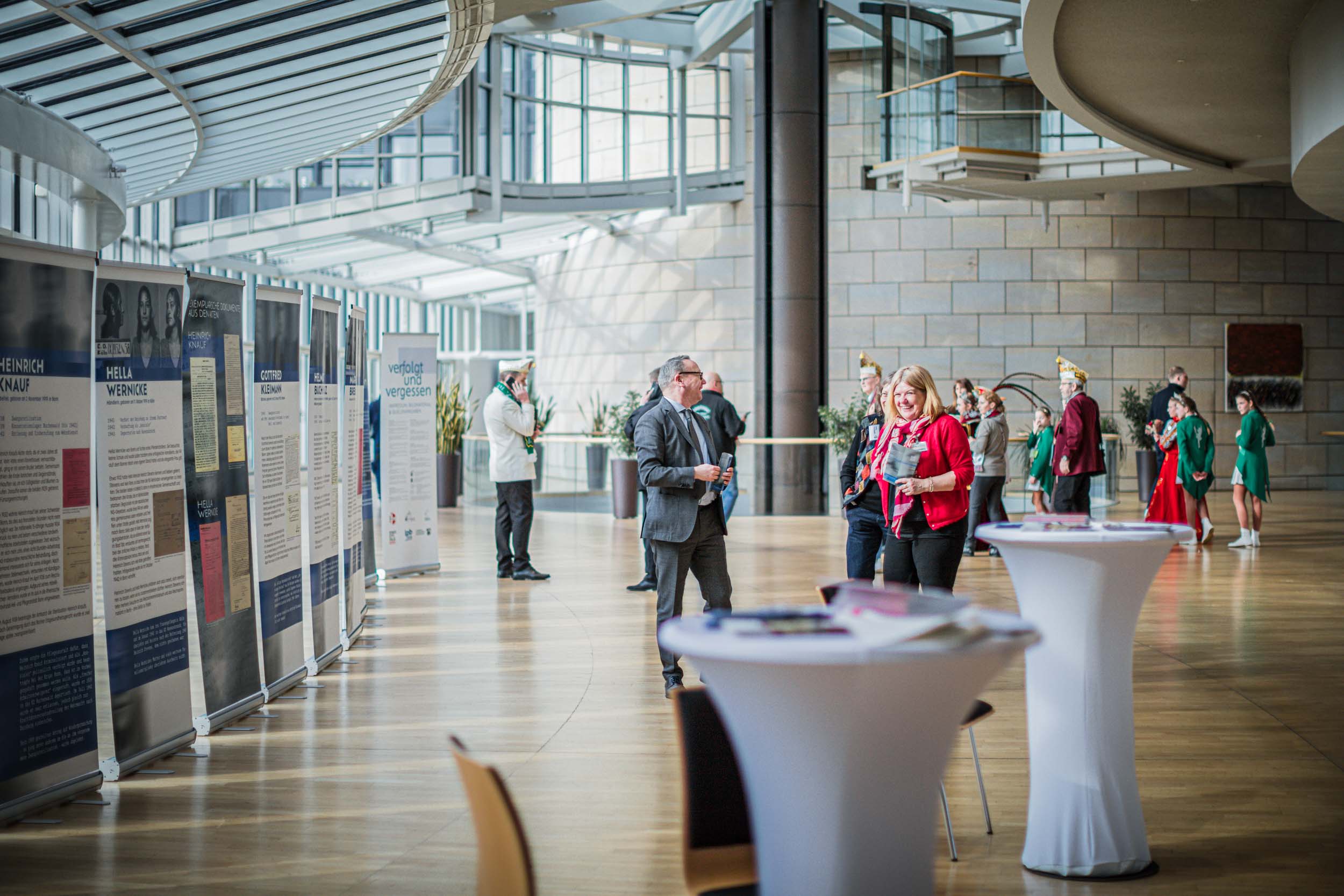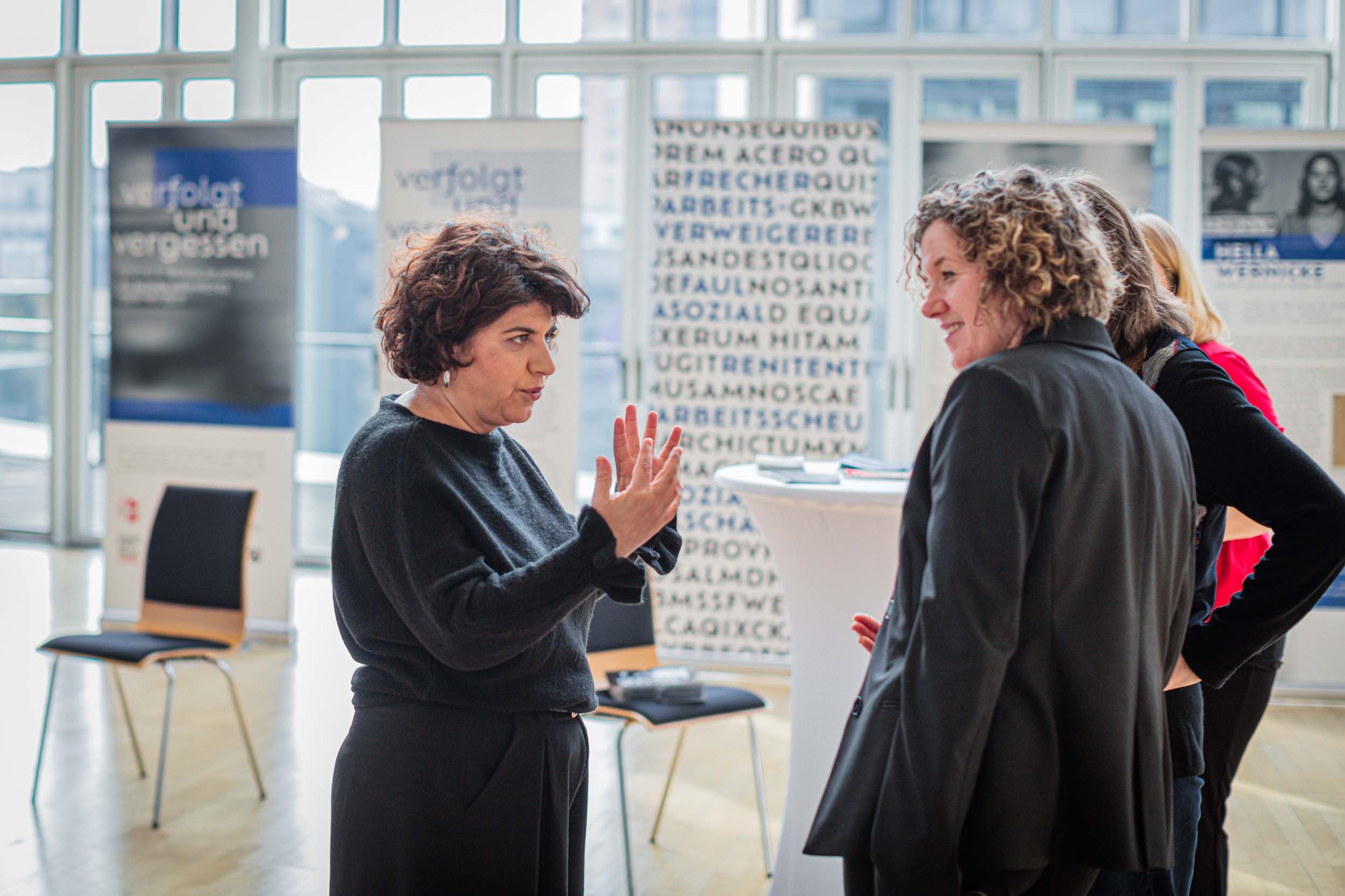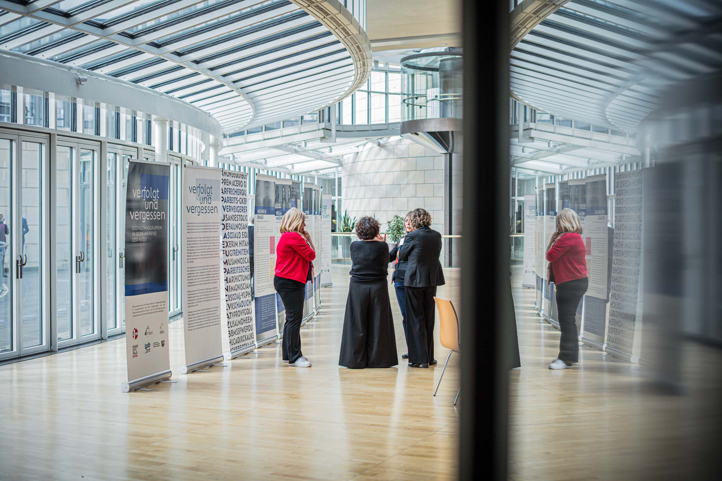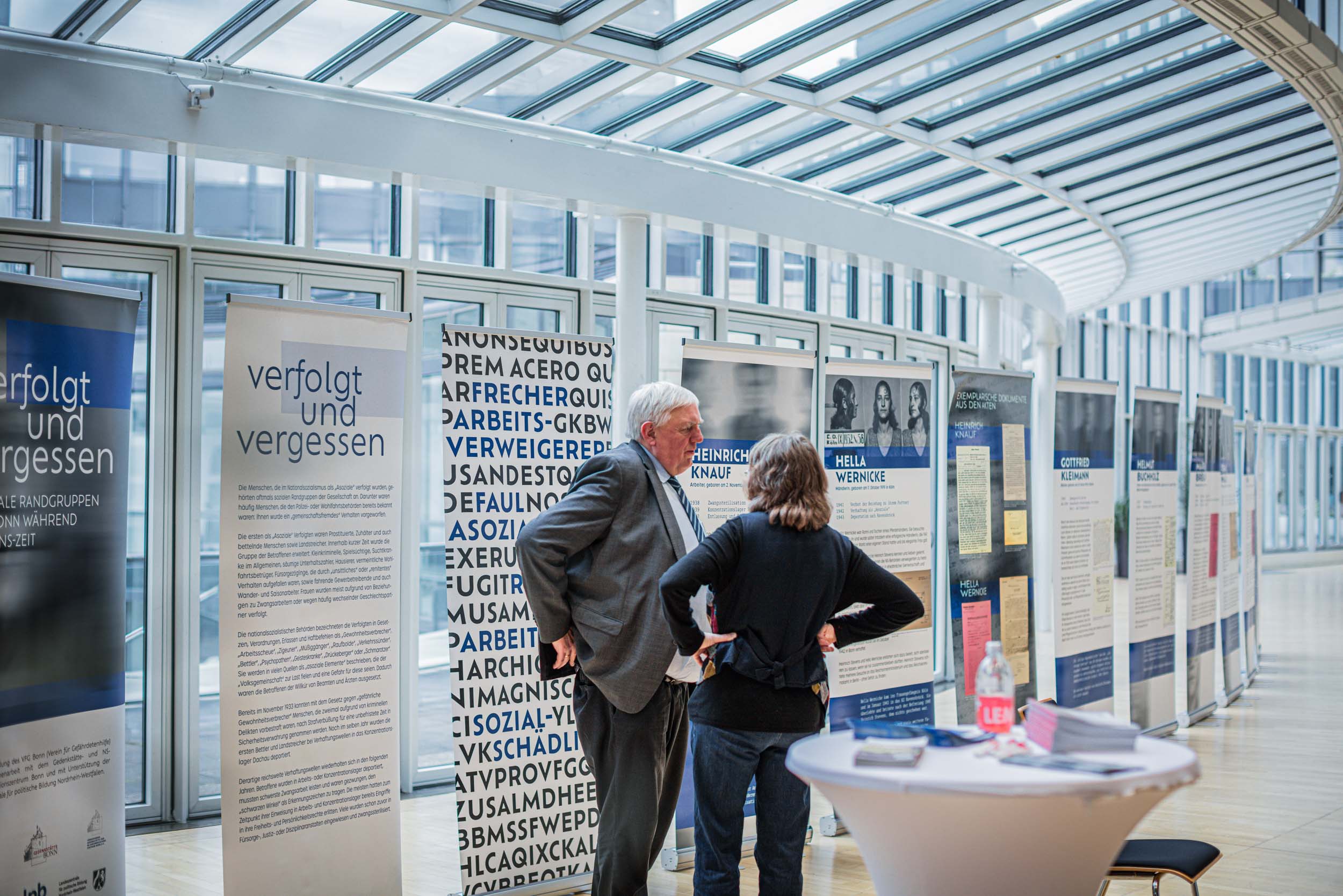 Zurück zur Übersicht 20. Februar 2025 Ausstellung „„verfolgt und vergessen“ im Düsseldorfer Landtag In Kooperation mit der Gedenkstätte Bonn: Wir freuen uns, die Ausstellung „Verfolgt und Vergessen – Soziale Randgruppen in Bonn während der NS-Zeit“ am 20. Februar 2025 im Düsseldorfer Landtag präsentieren zu dürfen. Ministerin Josefine Paul, Minister Karl-Josef Laumann, Minister Benjamin Limbach, Landtags Vizepräsidentin Berivan Aymaz und weitere Landtagsabgeordnete besuchten die Ausstellung und betonten die Bedeutung des Themas.Die Ausstellung widmet sich der Erinnerung an die Bonner Bürger und Bürgerinnen, die während der NS-Zeit als „Asoziale“ großes Leid ertragen mussten. In einer Zeit, geprägt von der menschenverachtenden Ideologie des Nationalsozialismus, wurden Menschen, die in schwierigen Lebensumständen lebten, wie Obdachlose, sowie jene, die von der gesellschaftlichen Norm abwichen, diskriminiert, verfolgt, zwangssterilisiert und ermordet.Ziel der Ausstellung ist es, ausgewählte Personen vorzustellen, die in Bonn als „Asoziale“ verfolgt wurden und zu den sozialen Randgruppen gehörten. Diese Menschen waren den Polizei- oder Wohlfahrtsbehörden bereits bekannt und wurden aufgrund eines als „gemeinschaftsfremd“ bezeichneten Verhaltens verfolgt. Verleih der Ausstellung: „Verfolgt und Vergessen – Soziale Randgruppen in Bonn während der NS-Zeit“ Dies Ausstellung umfasst 13 RollUps (Format 85x200cm), die das Schicksal einzelner Menschen der verfolgter Gruppen in Bonn beleuchten. Verleihzeitraum: bis zu vier Wochen, nach Absprache länger Ideal für Bildungseinrichtungen, kulturelle Institutionen, Krankenhäuser etc. Sie haben Interesse und möchten die Ausstellung in Ihren Räumlichkeiten zeigen? Sprechen Sie uns gern an.Verein für GefährdetenhilfeÖffentlichkeitsarbeitE-Mail: oeffentlichkeitsarbeit@vfg-bonn.deTelefon: 0228 – 9857645 Zustimmung verwalten Um dir ein optimales Erlebnis zu bieten, verwenden wir Technologien wie Cookies, um Geräteinformationen zu speichern und/oder darauf zuzugreifen. Wenn du diesen Technologien zustimmst, können wir Daten wie das Surfverhalten oder eindeutige IDs auf dieser Website verarbeiten. Wenn du deine Zustimmung nicht erteilst oder zurückziehst, können bestimmte Merkmale und Funktionen beeinträchtigt werden. Funktional Funktional Immer aktiv Die technische Speicherung oder der Zugang ist unbedingt erforderlich für den rechtmäßigen Zweck, die Nutzung eines bestimmten Dienstes zu ermöglichen, der vom Teilnehmer oder Nutzer ausdrücklich gewünscht wird, oder für den alleinigen Zweck, die Übertragung einer Nachricht über ein elektronisches Kommunikationsnetz durchzuführen. Vorlieben Vorlieben Die technische Speicherung oder der Zugriff ist für den rechtmäßigen Zweck der Speicherung von Präferenzen erforderlich, die nicht vom Abonnenten oder Benutzer angefordert wurden. Statistiken Statistiken Die technische Speicherung oder der Zugriff, der ausschließlich zu statistischen Zwecken erfolgt. Die technische Speicherung oder der Zugriff, der ausschließlich zu anonymen statistischen Zwecken verwendet wird. Ohne eine Vorladung, die freiwillige Zustimmung deines Internetdienstanbieters oder zusätzliche Aufzeichnungen von Dritten können die zu diesem Zweck gespeicherten oder abgerufenen Informationen allein in der Regel nicht dazu verwendet werden, dich zu identifizieren. Marketing Marketing Die technische Speicherung oder der Zugriff ist erforderlich, um Nutzerprofile zu erstellen, um Werbung zu versenden oder um den Nutzer auf einer Website oder über mehrere Websites hinweg zu ähnlichen Marketingzwecken zu verfolgen. Optionen verwalten Dienste verwalten Verwalten von {vendor_count}-Lieferanten Lese mehr über diese Zwecke Akzeptieren Ablehnen Einstellungen ansehen Einstellungen speichern Einstellungen ansehen {title} {title} {title} Zustimmung verwalten