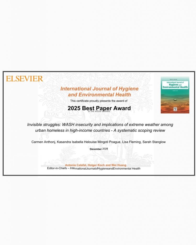 Best Paper Award 2025 für wissenschaftliche Literaturreview zu Wasser-, Sanitär- und Hygieneversorgung wohnungsloser MenschenDie wissenschaftliche Publikation„Invisible struggles: WASH insecurity and implications of extreme weather among urban homeless in high-income countries – A systematic scoping review“(abrufbar unter: https://doi.org/10.1016/j.ijheh.2023.114285)wurde mit dem Best Paper Award 2025 des International Journal of Hygiene and Environmental Health, gegründet 1883 als Archiv für Hygiene, und später umbenannt in Zentralblatt für Hygiene und Umweltmedizin (Elsevier) ausgezeichnet.Die Veröffentlichung ist eine wichtige wissenschaftliche Arbeit, da sie erstmals systematisch untersucht, wie fehlender Zugang zu Wasser, Toiletten und Hygiene die Gesundheit wohnungsloser Menschen in Städten wohlhabender Länder beeinflusst – insbesondere während extremer Wetterereignisse wie Hochwasser und Hitzewellen. Damit liefert sie einen relevanten Beitrag für Forschung und Praxis in der öffentlichen Gesundheit und Stadtplanung.Die Arbeit wurde federführend von Prof. Dr. Carmen Anthonj (Universität Twente, Niederlande) erstellt und analysierte 50 internationale wissenschaftliche Publikationen. Sarah Stanglow vom Verein für Gefährdetenhilfe war maßgeblich an der Arbeit beteiligt.Ein zentraler Praxisbezug ergibt sich aus dem Projekt„Zugang zu Wasser, Toiletten & Hygiene für Menschen ohne Obdach in Bonn“, das in Kooperation mit dem VFG Bonn und dem Caritasverband Bonn durchgeführt wurde. Der VFG Bonn brachte seine Erfahrung aus der Wohnungslosenhilfe ein und unterstützte die Einbindung von Betroffenenperspektiven. Sarah Stanglow begleitete das Projekt fachlich, und war auch an der Erstellung des ausgezeichneten Fachartikels maßgeblich beteiligt. Der Caritasverband für die Stadt Bonn e.V. stellte ebenfalls Expertise und Kontakte zu wohnungslosen Menschen bereit, die für die Datenerhebung und Praxisrelevanz entscheidend waren.Die Ergebnisse der Literaturreview zeigen, dass wohnungslose Menschen oft keinen sicheren Zugang zu Trinkwasser, Toiletten oder Duschen haben. Öffentliche Einrichtungen sind knapp, zeitlich eingeschränkt oder unhygienisch; kostenpflichtige Angebote sind oft unzugänglich. Extreme Wetterereignisse wie Hitzewellen, Kälteperioden oder Starkregen verschärfen die Situation zusätzlich und erhöhen die gesundheitlichen Risiken. Besonders Frauen sind betroffen, während bestehende Daten- und Forschungslücken die Entwicklung besserer Versorgungssysteme erschweren.Auf Grundlage der Analyse wurde ein Rahmenmodell (siehe Anlage) entwickelt, das das Zusammenspiel von WASH, Extremwetter und Wohnungslosigkeit systematisch erfasst. Es bietet eine Grundlage für gesundheitsorientierte, klimaresiliente Stadtplanung.Der Best Paper Award wird jährlich vergeben und würdigt Arbeiten mit besonderer wissenschaftlicher Qualität und gesellschaftlicher Relevanz.