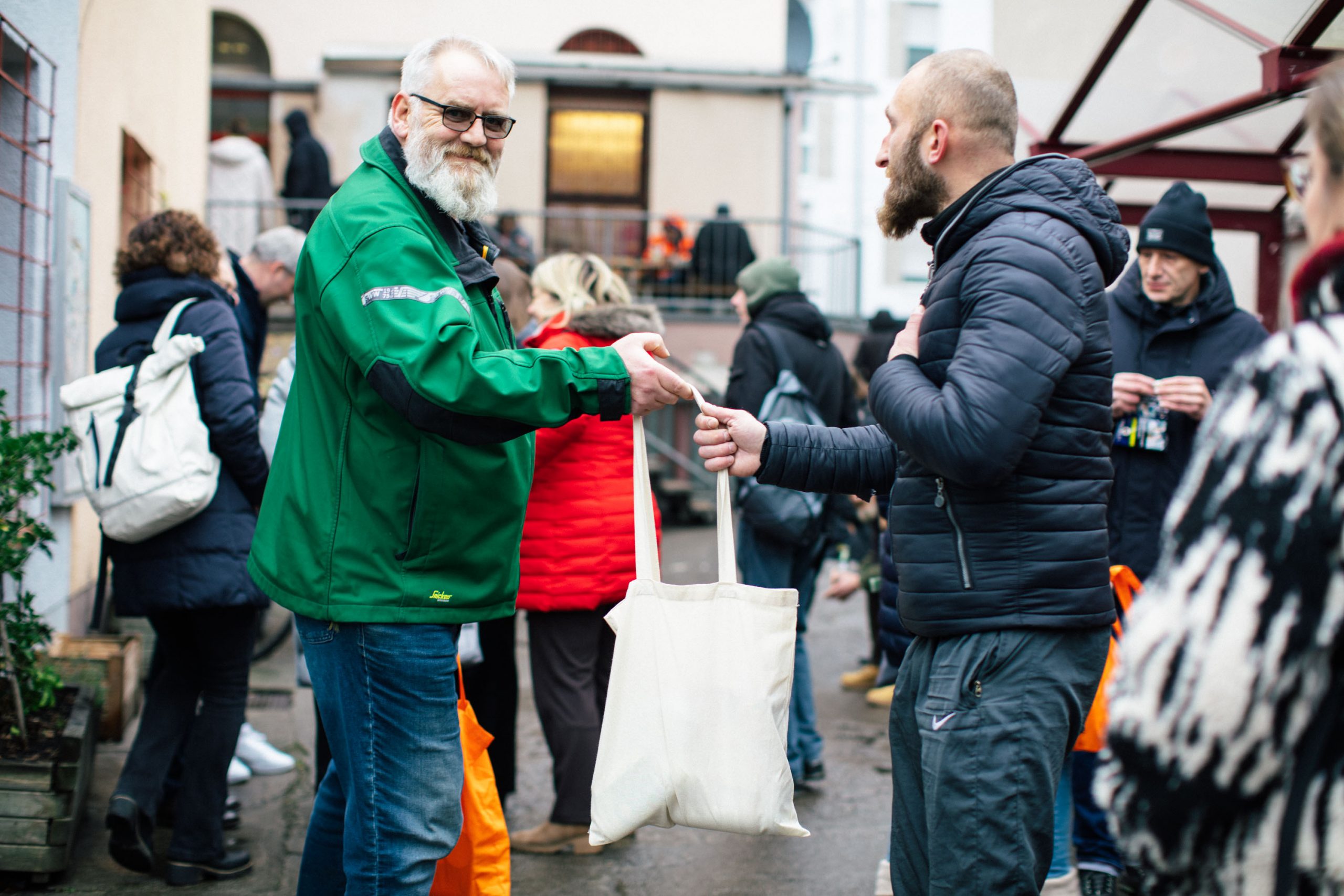 Die gespendeten Beutel enthalten zahlreiche Artikel, die den Alltag der Betroffenen erleichtern können: u. a. Duschgel, Shampoo, Unterwäsche, Socken, Wärmepads, Hygieneartikel, löslicher Kaffee, Tee, Konservendosen und Süßigkeiten. Als besonderes Highlight hat der Biohof Bursch aus Bornheim jedem Beutel eine Bio-Süßkartoffel-Suppe im Glas beigefügt. Die farblich markierten Jutebeutel – orange für Damen, blau für Herren und grau für unisex – sorgen dafür, dass individuelle Bedürfnisse Berücksichtigung finden.
